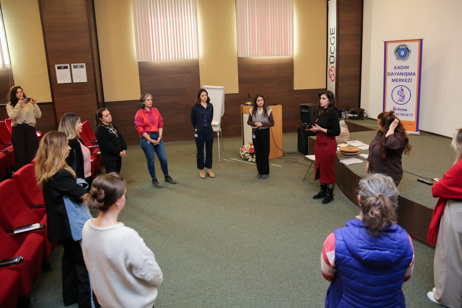 Proje kapsamında, ÜÇGE fabrikasında çalışan kadınların katılımıyla ‘Hak Çemberi Atölyesi’ düzenlendi. Atölyede ‘eşit işe, eşit ücret’ ilkesi, güvenceli çalışma hakkı, ev içi emeğin ve bakım sorumluluklarının görünmezliği gibi başlıklar ele alındı. Yaratıcı drama teknikleri, rol alma ve bedensel ifade yöntemleriyle desteklenen atölye sürecinde katılımcılar, kendi yaşam deneyimlerinden yola çıkarak ekonomik hakları tartışma imkânı buldu.