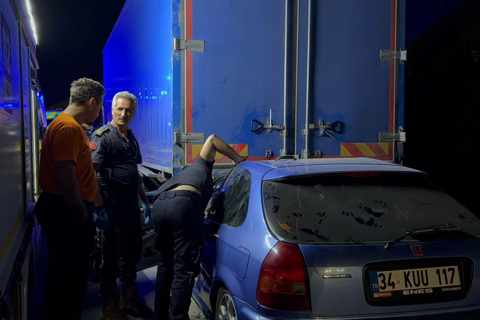 Çarpışmanın etkisiyle otomobil kamyonun altına girdi. İhbar üzerine olay yerine sağlık, polis ve itfaiye ekibi sevk edildi.
