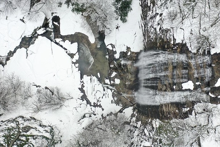 Kar örtüsünün arasından süzülen Suuçtu Şelalesi ve çevresi dronla görüntülendi.