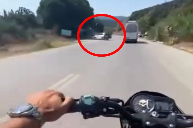 Kaza anı ise aynı yolda seyir halinde olan başka bir motosiklet sürücüsünün kask kamerasına yansıdı.