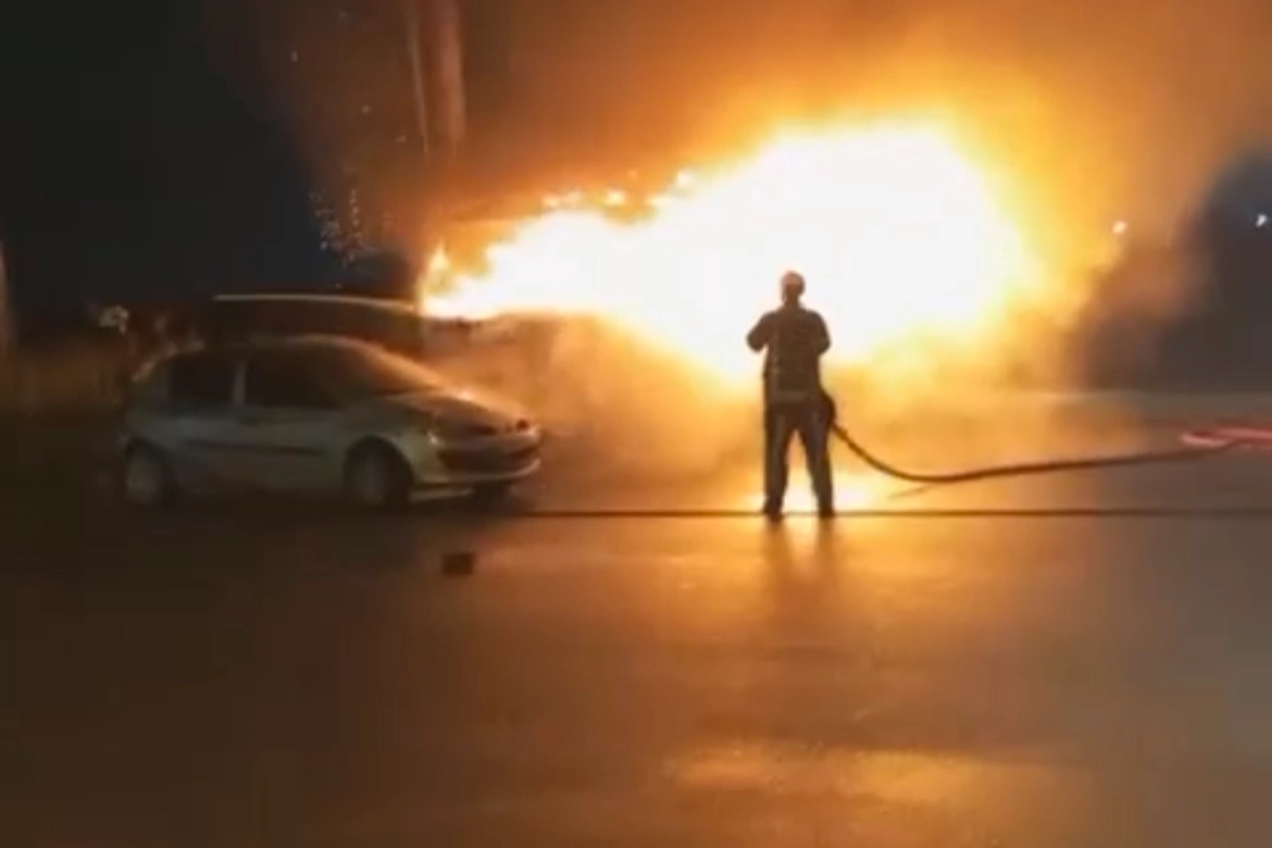İhbar üzerine olay yerine gelen itfaiye ekipleri yangını söndürürken, araç kullanılamaz hale geldi. Alev alev yanan araç, amatör kameraya yansıdı.