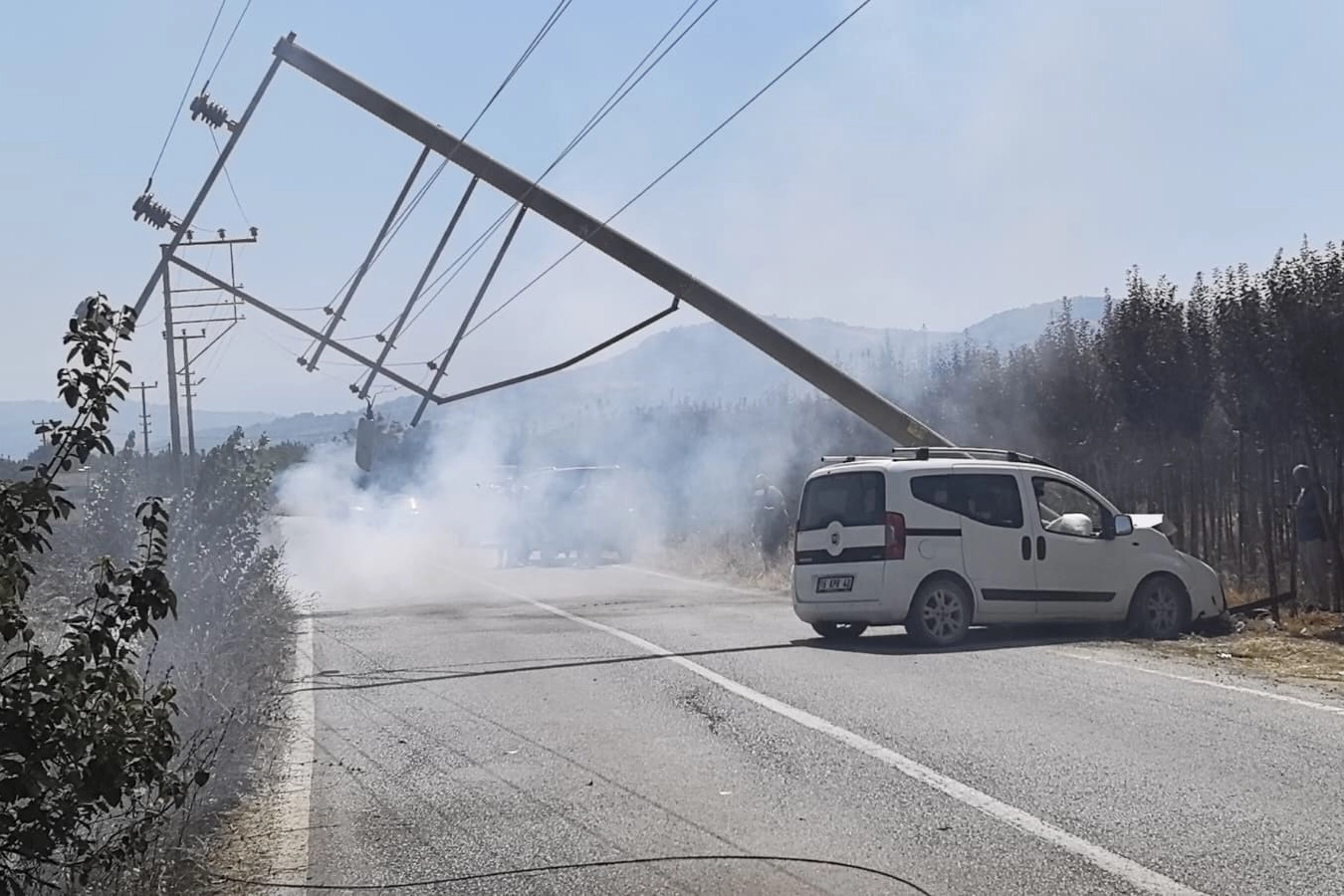 Jandarma komutanlığı ekiplerinin kazayla ilgili tahkikatı sürerken, tamamen devrilmek üzere olan direğin altından geçen sürücüler, dikkatlerden kaçmadı.