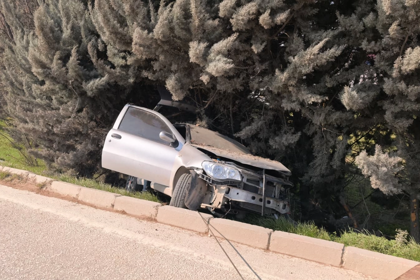Alanyurt'tan İnegöl'e seyir halinde olan Aziz D.(57) yönetimindeki 16 ACK 76 plakalı otomobil, iddiaya göre başka bir aracın sıkıştırması sonucu sürücüsünün kontrolünden çıktı. Yoldan çıkan araç alışveriş merkezi bahçesindeki ağaçlara çarparak durabildi.