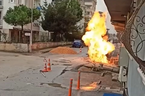 Bursa'da altyapı çalışması için kazı yapan kepçe operatörünün dalgınlığı mahalleliyi havaya uçuracaktı. Doğalgaz borusunun patlaması sonucu çıkan yangına itfaiye ekipleri müdahale etti. Patlama ve alevler mahallede büyük paniğe yol açtı.