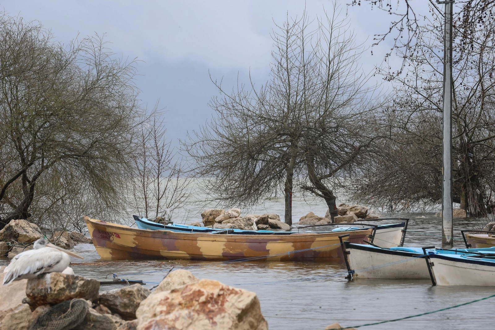 Bursa'da 2 gündür etkili olan sağanak nedeniyle Uluabat Gölü'nün suları, "Küçük Venedik" olarak bilinen Gölyazı Mahallesi'nin kıyı şeridindeki ev ve iş yerlerinin duvarlarına dayandı.