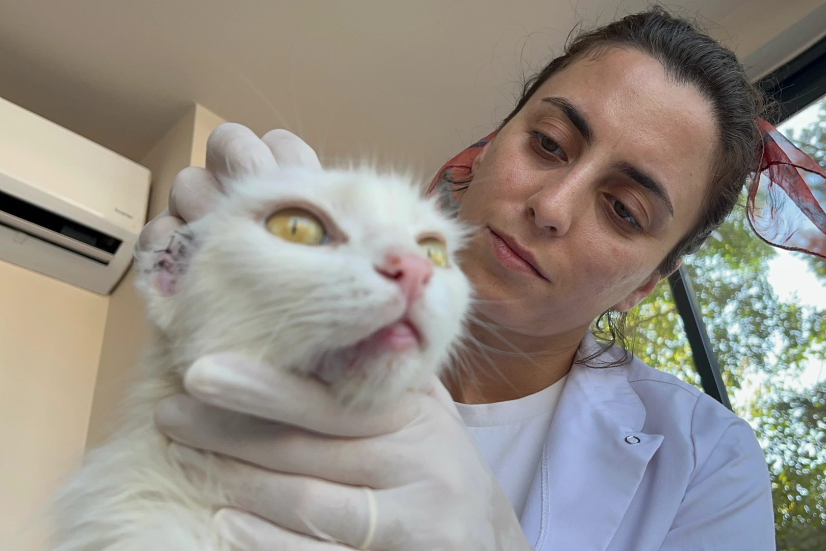 Kesilen kulağında enfeksiyon oluşan kedi veteriner hekime getirildi. Her 2 kulağı da duymayan kediye, 'Sütlaç' adı verildi.