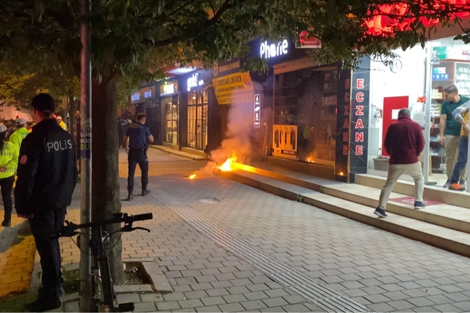 Olay, İnegöl ilçesinde meydana geldi. Galatasaray’ın şampiyon olması ile kutlamalar için sokağa çıkan taraftarlar, bir süre sonra Fenerbahçeliler Derneği’nin önüne geldi. Burada bir taraftar, yaktığı meşaleyi derneğe doğru fırlattı. Bunun üzerine polis ekipleri, taraftarı etkisiz hale getirdi. Yapılan üst aramasında üzerinden bıçak çıkan taraftar gözaltına alındı.