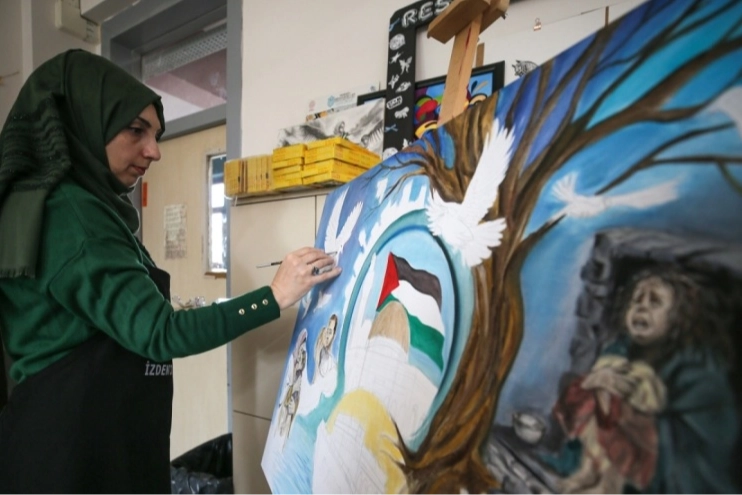 Okulun görsel sanatlar öğretmenlerinden İzden Coşkun da etkinliğe 10. ve 11. sınıf öğrencilerinin katıldığını ve Filistin halkının uğradığı zulmü sanatın evrensel diliyle anlatmaya çalıştıklarını dile getirdi.
