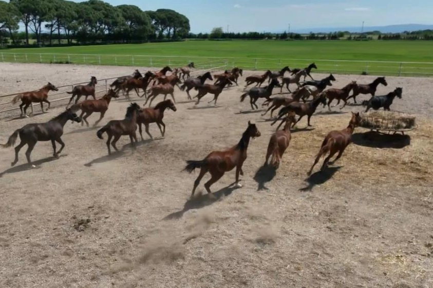 Bugün pistlerde koşan Arap atlarının yarısından fazlasını yetiştiren işletmede büyük bir titizlikle yetiştirilen Türk Arap atları drone ile görüntülendi. Her gün belli saatlerde açık alana salınan atların enerjilerini atmaları, koşuşturmaları ve birbirleriyle oynaşmaları görüntülere yansıdı.