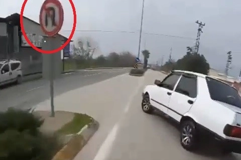 Görüntülerde, otomobil sürücüsünün tabelaya rağmen u dönüşünün yasak olduğu yerden sinyal vermeden geçiş yapmaya çalıştığı görüldü.