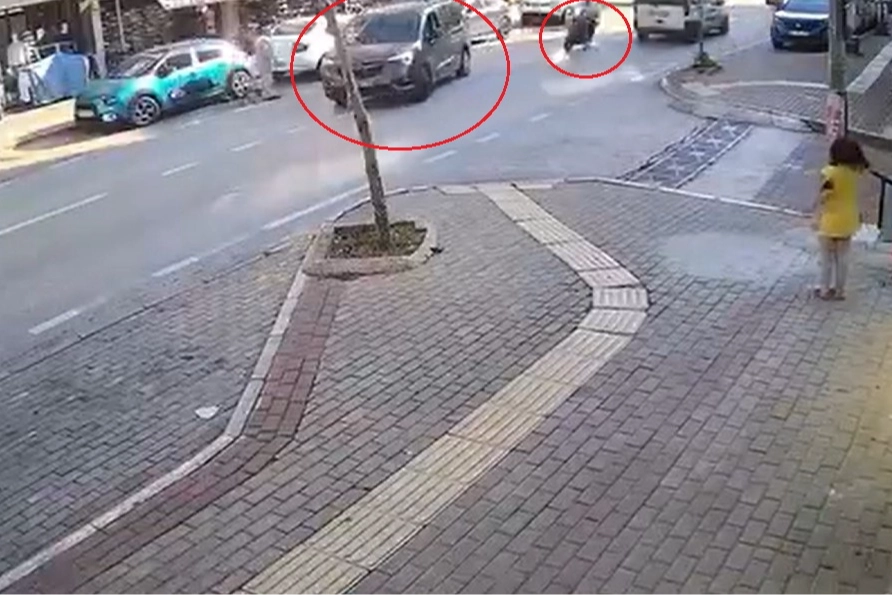 Kask kamerasına yansıyan görüntülerde, otomobilin ani manevrası ve çarpışma anı net bir şekilde görülüyor.