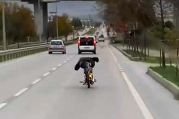 Görüntülerde kasksız motosiklet sürücüsünün, iki teker üzerinde yatarak ilerlemesi yer alıyor.