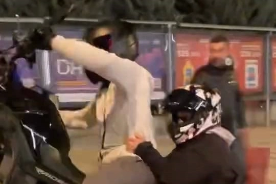 Kaza anı, çevredeki bir sürücünün cep telefonu kamerasına yansıdı. Görüntülerde, motosikletin ön tekerleğini kaldırmaya çalıştığı sırada devrildiği ve iki kişinin yola savrulduğu anlar yer alıyor.