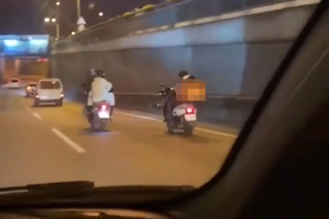 Bir süre bu şekilde giden motosiklet sürücüsü, hem kendinin canını hem de trafiği tehlikeye attığından habersiz gözden kayboldu. Yaşanan bu anlar ise, bir vatandaşın cep telefonu kamerasına yansıdı.