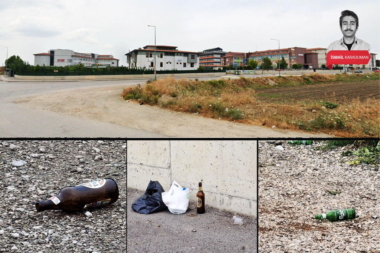 Hava kararınca araçlarıyla gelip sofra kuran şahıslar, boş alkol şişelerini de okulun yanı başında bırakıyor.