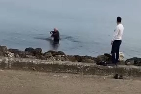 Martının su üzerinde hareketsiz şekilde çırpınmaya çalıştığını gören vatandaş, hiç tereddüt etmeden kıyafetleriyle birlikte denize girerek martıyı güvenli bir alana çıkardı.