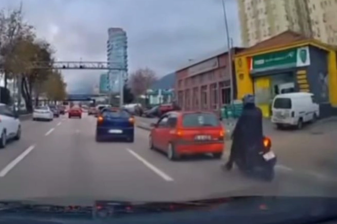 Kontrolünü kaybeden sürücü, yoğun araç trafiğinin olduğu cadde üzerinde yere düştü.
