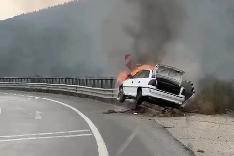 Yol kenarından bariyerlere dalan otomobil, motor kısmından alev almaya başladı.