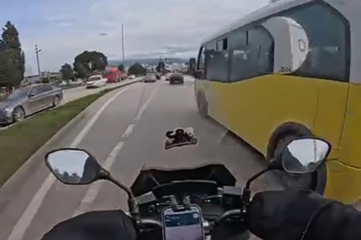 Olay, Bursa’nın Nilüfer ilçesine bağlı Üçevler Mahallesi Nilüfer Caddesi üzerinde meydana geldi. Kendi şeridinde ilerleyen motosiklet sürücüsünün önüne bir anda otobüs kırdı. Ani refleksle sol şeride geçerek kazadan son anda kurtulan motosikletli, otobüs şoförüne tepki gösterdi.