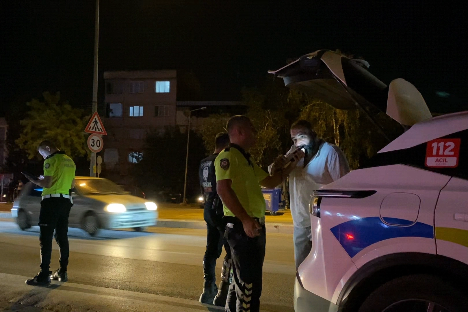 Ekiplerin ‘Dur’ ihtarına uymayan otobüs şoförü, kırmızı ışık ihlali yapıp yaklaşık 300 metre ilerideki durakta durdu. Aracın yanına gelen ekipler, şoförü indirerek alkol testi yaptı.