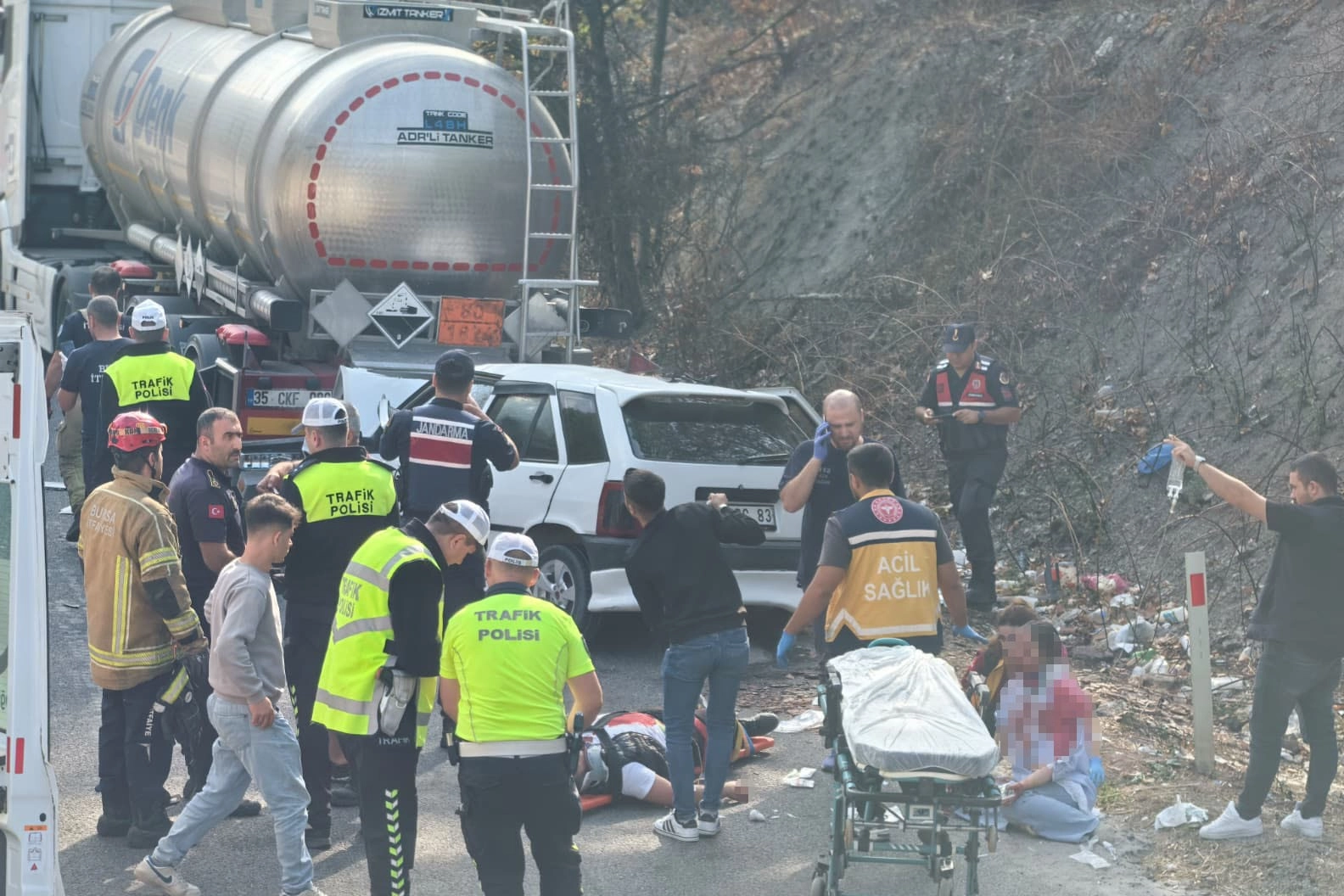 İnegöl'den Bozüyük istikametine seyir halinde olan Sürücü Enes Y.(30) yönetimindeki 10 BDC 83 plakalı otomobil, iddiaya göre sürücüsünün uyuması sonucu kontrolden çıktı. Yoldan çıkan otomobil yol kenarında park halinde olan Mehmet G.(52) yönetimindeki 35 BZP 594 plakalı asit yüklü tankere arkadan çarptı. Kaza sonucu otomobilin sürücüsü ile araçtaki Merve Y.(26), Fevzi Y.(60), Hatice Y.(52) ve 1 yaşındaki Asil Y. Yaralandılar. Kaza yerine 112, Jandarma, Bölge Trafik ekipleri ve İtfaiye arama kurtarma ekipleri sevk edildi. Ekipler araçta sıkışan yaralıları kurtardı. Yaralılar kaza yerine sevk edilen Ambulanslarla İnegöl Devlet Hastanesine kaldırıldı. Yaralılardan bebek ile Hatice Y.'nin sağlık durumunun ciddiyetini koruyor. Bölge Trafik ekipleri yolu kontrollü şekilde ulaşıma açarken, Jandarma komutanlığı ekipleri kazayla ilgili soruşturma başlattı.