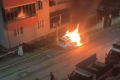 Gümüştepe Mahallesinde binaların arasında biranda dumanların yükselmesiyle alev topuna dönen otomobil, kısa sürede herkesi telaşa soktu.