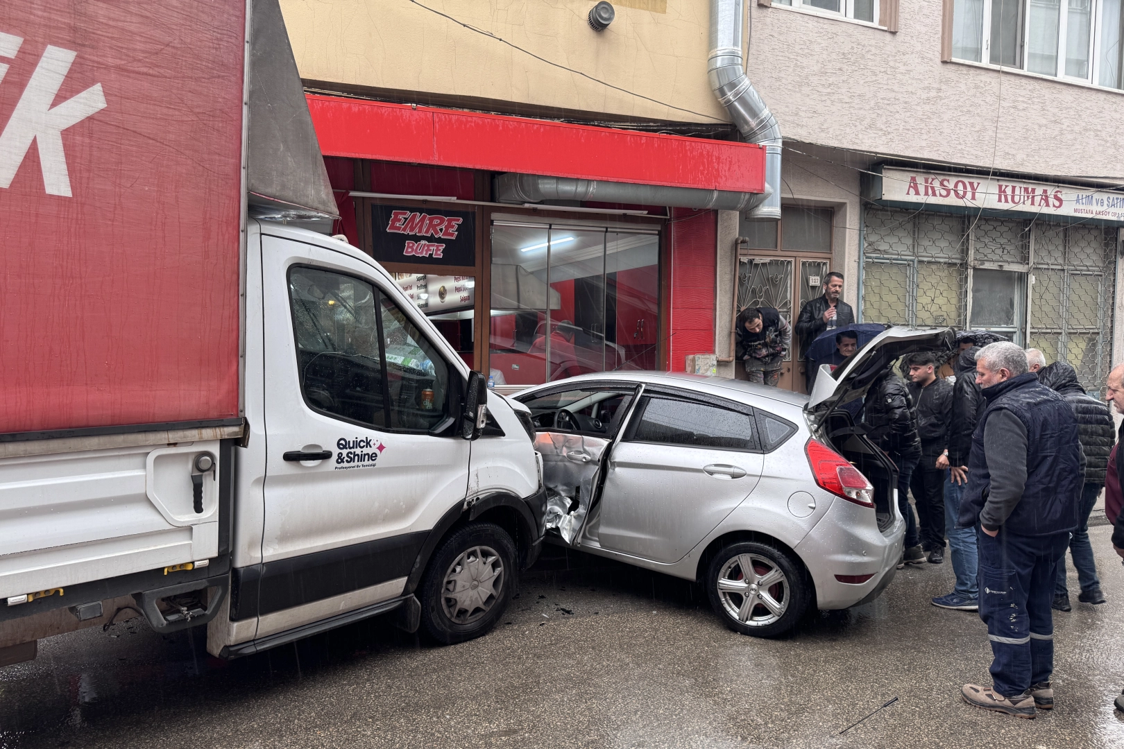 Otomobil sürücüsünün ehliyetsiz olduğu öğrenilirken, çarpmanın etkisiyle iş yerinde ve araçlarda hasar oluştu.