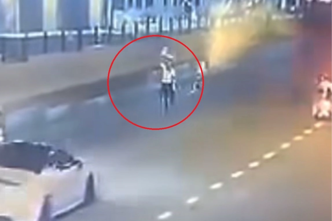 Kaçan aracı durdurmak için bir polis memuru ise refleksle yerden aldığı trafik dubasını araca fırlatarak aracın önünü kesmeye çalıştı. O anlar güvenlik kamerasına anbean yansıdı.