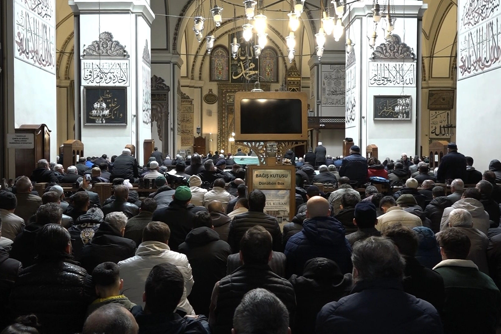 Ulu Cami’de namazını kılmak isteyen vatandaşlar ezan vaktinden önce camiye gelmeye başladı. Cami içerisinde yer bulamayan vatandaşlar namazı cami avlusunda kıldı.