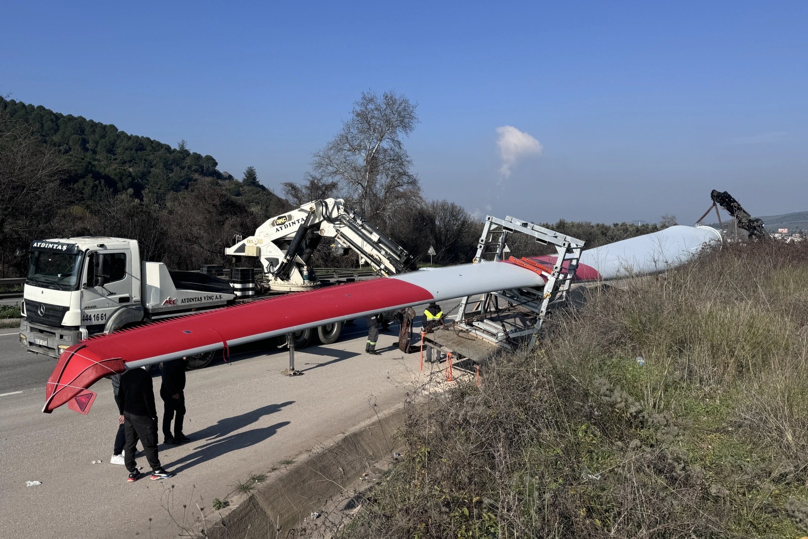 İzmir'den Gemport Limanı'na rüzgar türbininin kanadını taşıyan 35 KF 8097 plakalı tırın dorse kısmı, Gemlik ilçesi yakınlarında sürücüsünün direksiyon hakimiyetini kaybetmesi sonucu yol kenarındaki yağmur suyu kanalına düştü.