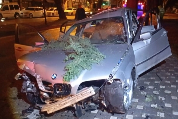 Kontrolden çıkan otomobil önce kaldırımda bulunan trafik uyarı levhasına çarptı, ardından savrularak ağaca vurdu.