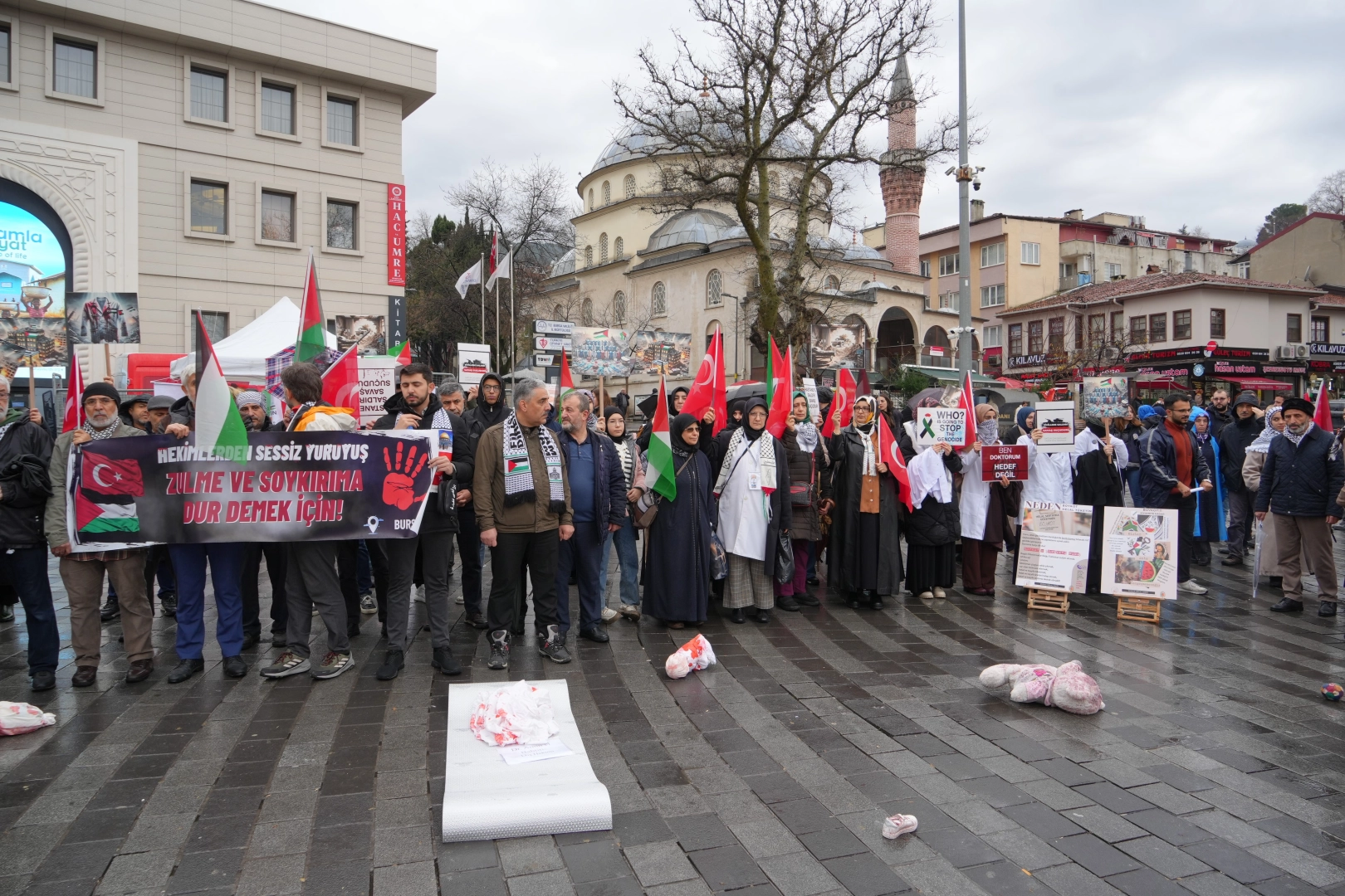 Doktorlar adına konuşan Tarık Yaşa, "Bizler; memleketimizin dört bir yanında görev yapan hekim ve sağlık çalışanları olarak Gazze'deki sağlık krizini bir yılı aşkın bir süredir, büyük bir endişe ve öfke ile takip etmekteyiz. Sahada çalışan gazetecilerden, Gazzeli meslektaşlarımızdan, insani ve uluslararası yardım çalışmaları yapan kuruluş ve organizasyonlardan bize ulaşan bilgiler, durumun vehametini tüm açıklığıyla gözler önüne sermektedir. Gazze'deki ablukanın insani yardım girişi ve dağıtımına engel olduğuna, yardım ekipleri ve su kaynaklarına yönelik yoğun saldırılarla birlikte kasten organize edilmiş bir kıtlığa sebep olduğuna ve sağlık sisteminin sistemli saldırılarla tarumar edildiğine ne yazık ki tanık olmaktayız. Gazze'nin her yerinde insansız hava araçlarıyla, keskin nişancılarla, hava ve kara bombardımanıyla, sivil çocuklara, kadınlara ve erkeklere yönelik katliamlar gerçekleştiriliyor. Yüzde 70'i kadın ve çocuklar olmak üzere 45 binden fazla insan İsrail saldırılarında hayatını kaybetti. Yerleşim alanlarının kasıtlı olarak yok edildiğine şahit olduk. 450 günü aşkındır evlerinden sürülen, güvencesiz şartlar altında yaşamaya zorlanan kardeşlerimizin mazlumluğuna şahit olmaktayız" dedi.