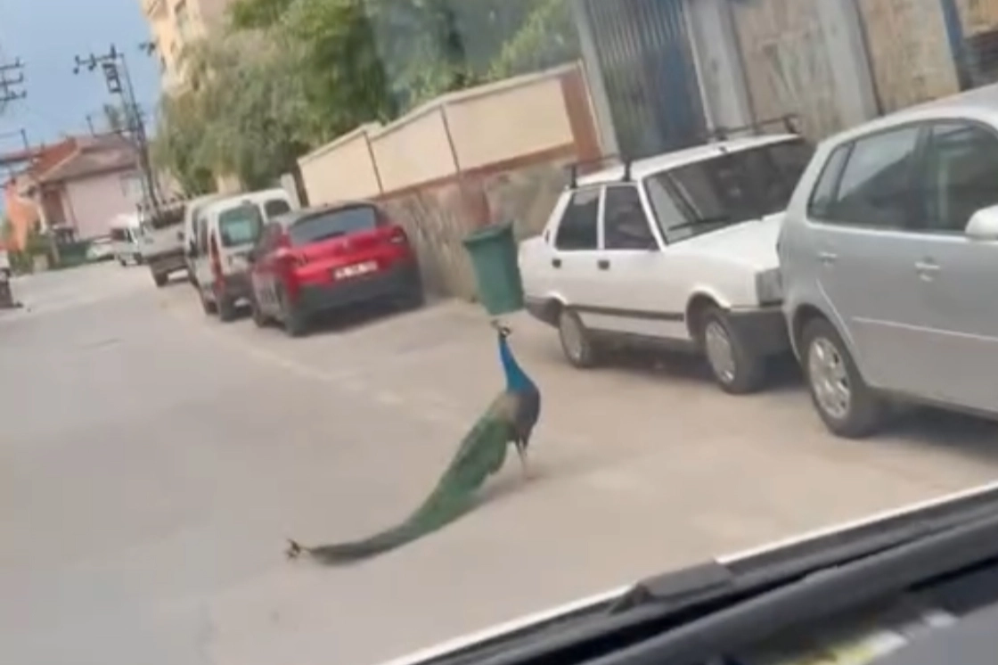 Osmangazi ilçesi Hamitler Mahallesi'nde sokak aralarında ilerleyen bir sürücü, yol ortasında dolaşan tavus kuşunu fark edince aracını yavaşlattı.