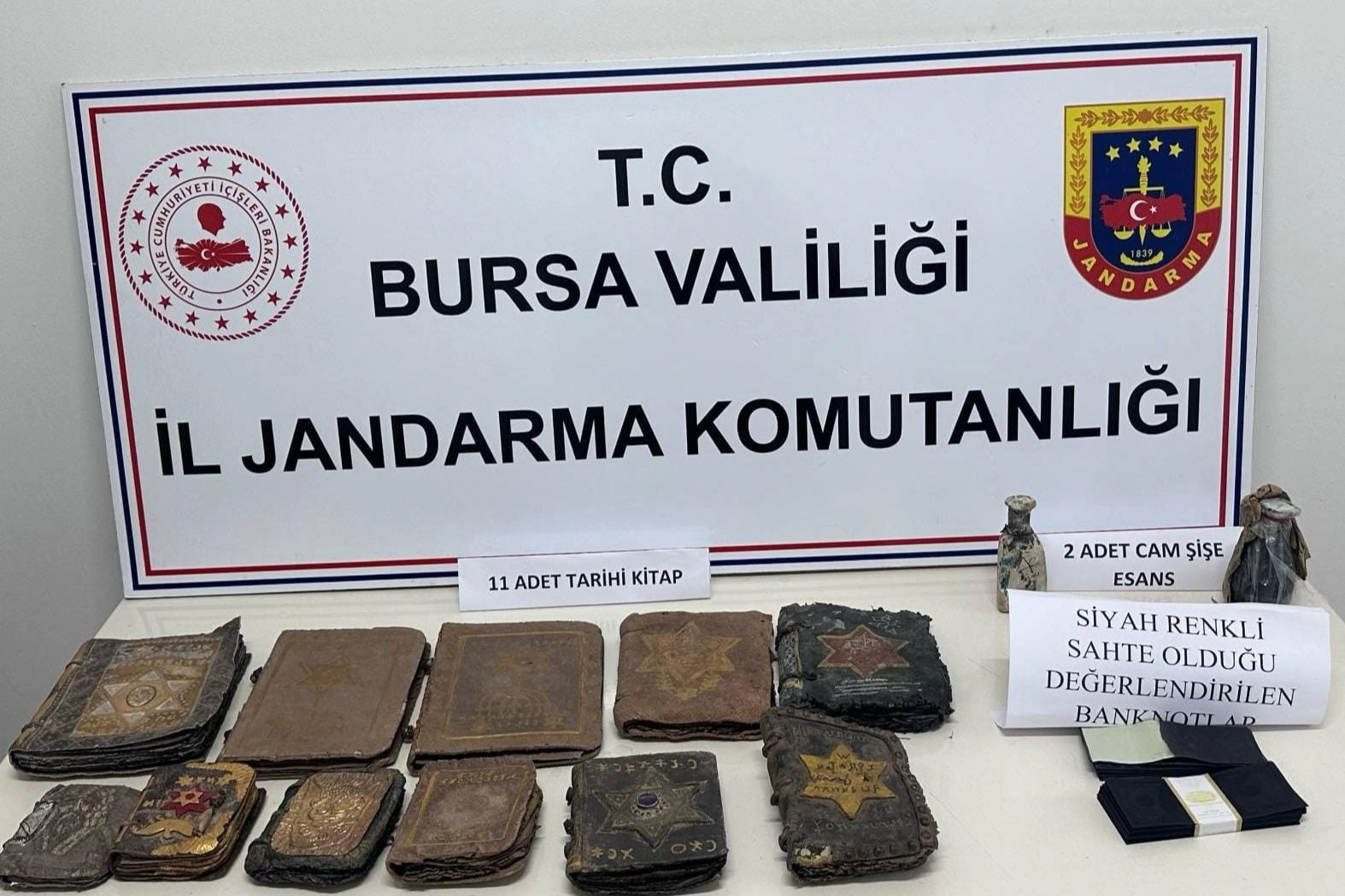 Evde yapılan aramada tarihi eser olduğu düşünülen 11 adet altın yazmalı kitap,141 adet sahte olduğu değerlendirilen görünüm değiştiren özelliğe sahip siyah dolar banknot, 2 adet cam şişe esans, 1 adet cep telefonu,1 adet tablet ele geçirildi.