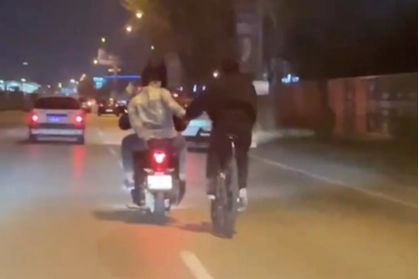 Beraber seyretmeye başlayan motosiklet ve bisiklet sürücüsünün tehlikeli yolculuğu amatör kameraya yansıdı.