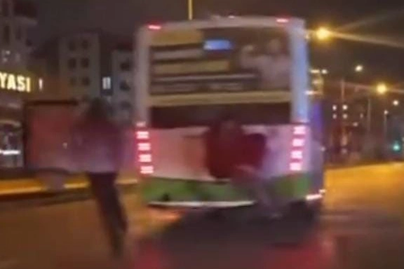 Otobüs hareket halindeyken arkada asılı şekilde ilerleyen çocukları gören vatandaşlar panik yaşadı.