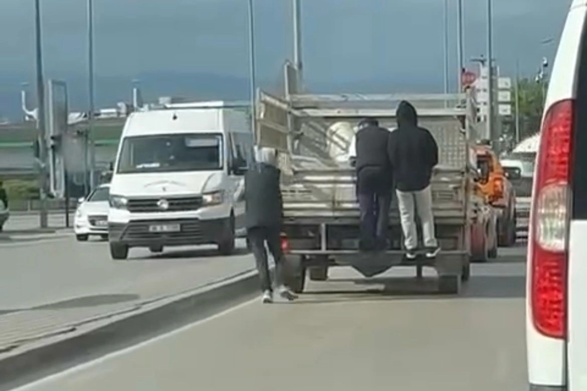 Olay, merkez Osmangazi ilçesi Sanayi Caddesi'nde meydana geldi. 3 genç, canlarını hiçe sayarak açık kasa kamyonetin arkasına tutundu.