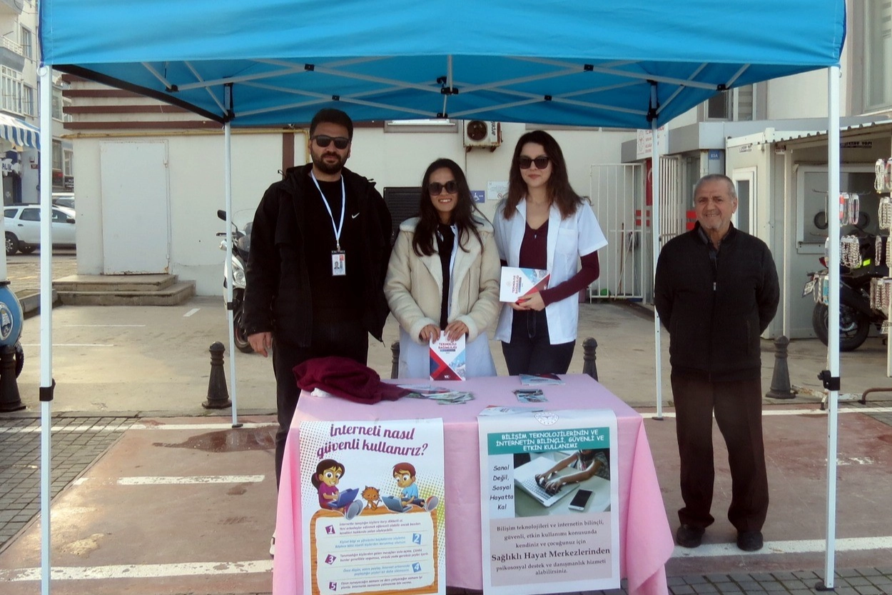 Mudanya Şaziye Rüştü Sağlıklı Hayat Merkezi önünde açılan stantta, teknolojik bağımlığın çocuklar üzerindeki etkileri konusunda broşürler dağıtarak ailelerin bilgilendiriliyor.