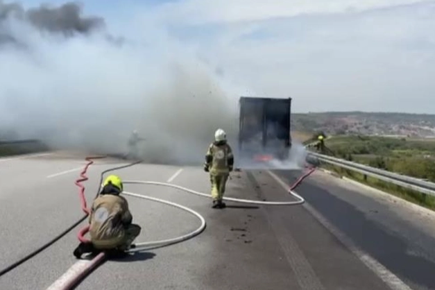 Edinilen bilgilere göre, seyir halindeki tırın dorsesinde henüz belirlenemeyen bir nedenle yangın çıktı. Presli kartonların tutuşmasıyla birlikte alevler hızla yayılarak tüm dorsayı kapladı.