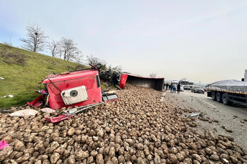 Edinilen bilgiye göre, şeker pancarı yüklü tır, sürücüsünün kontrolünden çıkıp önce hafif ticari araca, sonra kamyonete çarptı.