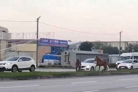 Sabah erken saatlerde refüjdeki yeşillik için yolun ortasına gelen 2 at, ilerleyen saatlerde trafik yoğunlaşınca ne yapacağını şaşırdı.