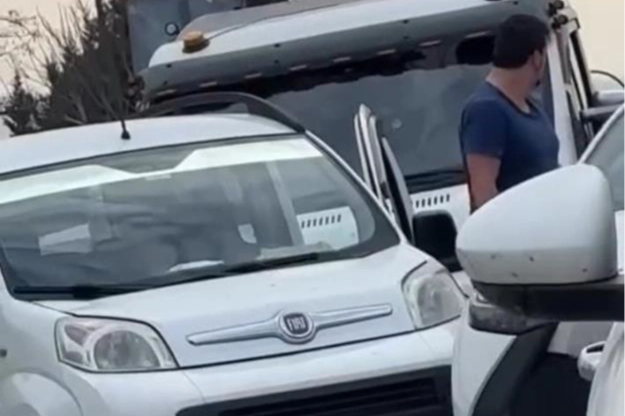 Aracından inen sürücü, kamyonete yönelerek saldırmaya başladı.