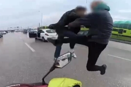 Korku dolu anlar kameraya yansırken, tarafları yoldan geçen kurye ve çevredeki sürücüler ayırdı. Görüntüler üzerine harekete geçen Bursa İl Emniyet Müdürlüğü ekipleri, kavga eden sürücülerin Serkan K. ile Emirhan A. olduğunu tespit etti. İki sürücü gözaltına alındı.