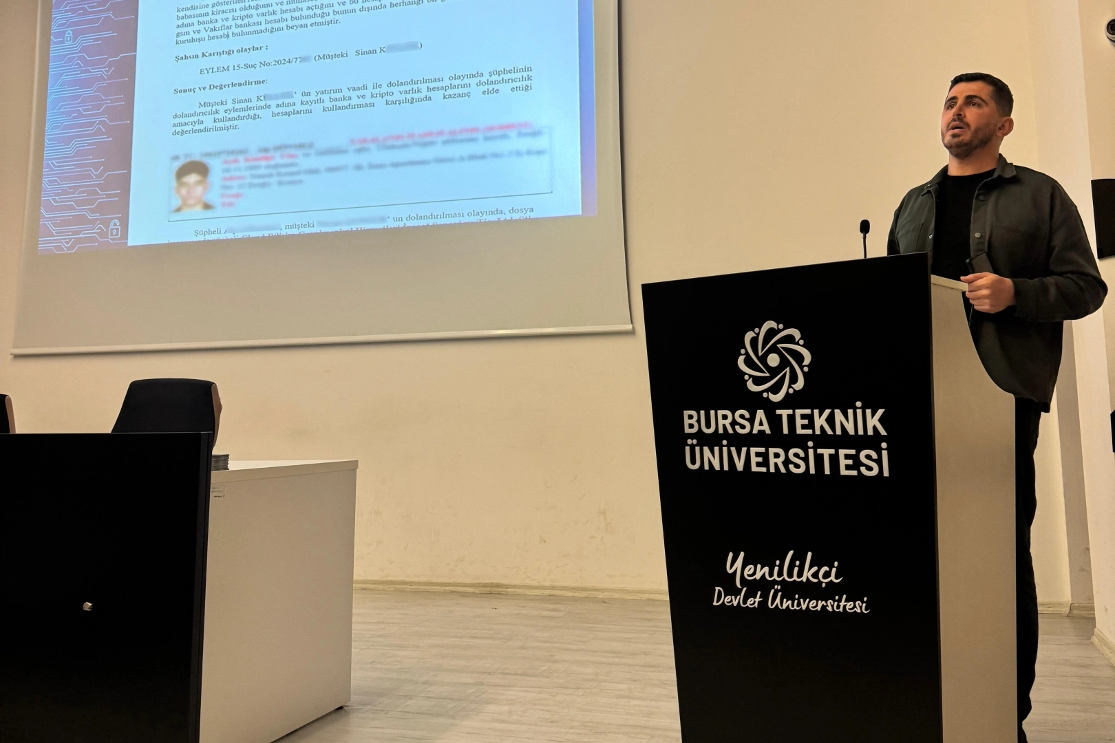 Bursa İl Emniyet Siber Suçlarla Mücadele biriminde görevli polis memuru Zekeriya Değirmen ise internet ortamında işlenen dolandırıcılık yöntemleri, kişisel verilerin korunması ve güvenli internet kullanımı konusunda gençlere bilgi verdi.
