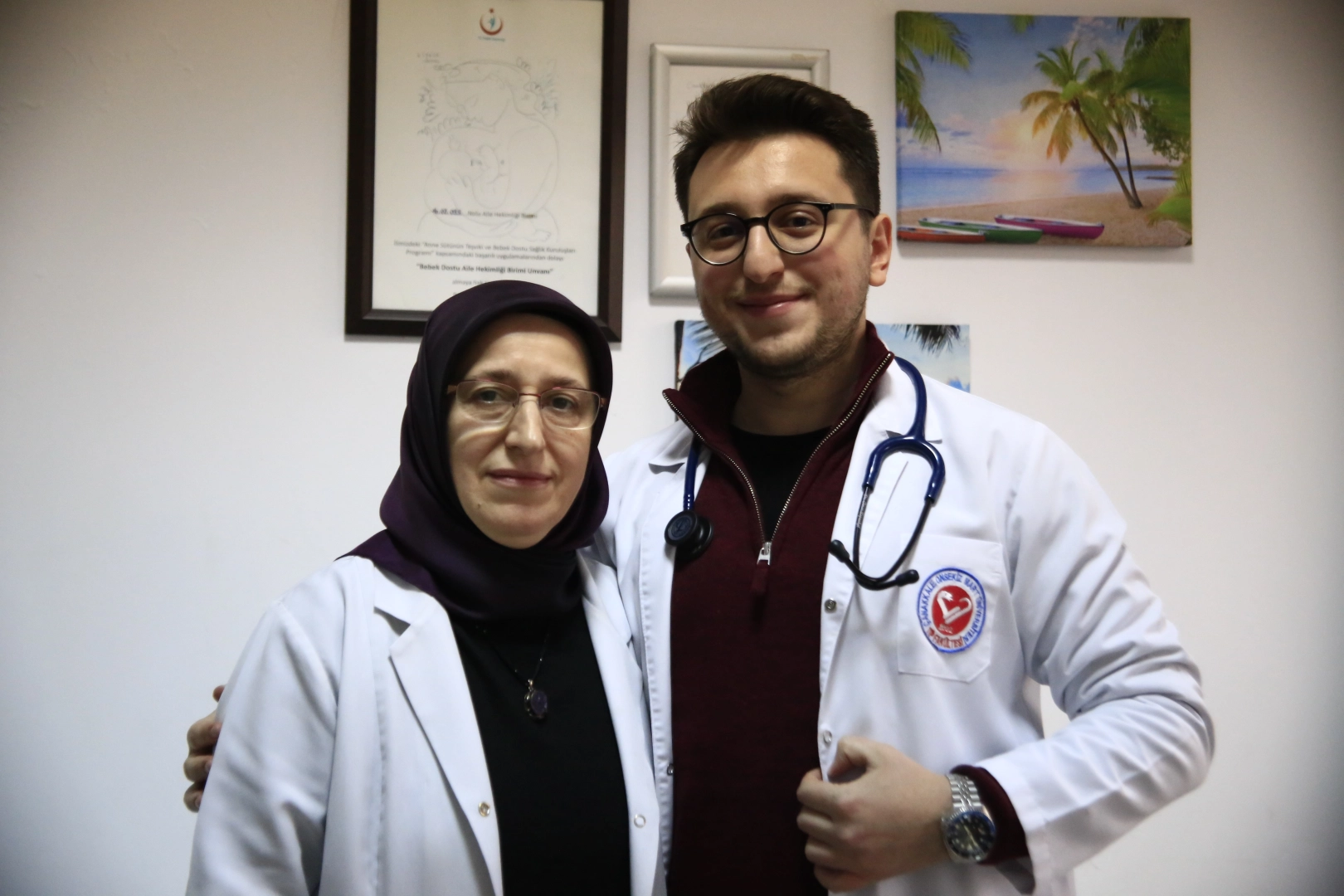 Meslek tercihinde annesini örnek aldığını söyleyen Dr. Ömer Faruk Topsakal, "Çanakkale Üniversitesi'nden 2024 yılında mezun oldum. Buraya atanmadan önce 112 Acil Servisi'nde görev aldım. Sonrasında da biraz annemi de örnek alarak aile hekimliğine geçtim. İlk mesaimizi yaptık, aslında daha çok taze. Birlikte çalışmak çok güzel, alışmaya çalışıyorum. Sisteme adapte olmaya çalışıyorum. Annem burada yaklaşık 17 yıldır çalışıyor. Küçükken kardeşimle buraya oyun oynamaya da gelirdik. Çocukken burada güzel vakitler geçirmiştik. Annemi örnek alıyordum. Hem meslek seçimimde olsun hem de burayı tercih açısından da onun izinden gittim. Özverili çalışarak ve hasta bakma açısından da her zaman annemi örnek almaya devam ediyorum. Kahvaltı yapacaksak eğer evde beraber yapıyoruz, ama bazen de yapmıyoruz tabii ki. Bazen de buraya vardığımızda yapıyoruz atıştırıyoruz. İşe yeni başladığım için annem bana çok yardımcı oluyor. Zaten odalarımız da yan yana oldu. Üniversiteden arkadaşlarım da ilk önce şaşırdılar, güzel tepkiler aldım herkesten. Annemin emeklilik düşünceleri vardı ama belki ben geldiğim için bu fikrini erteleyebilir" dedi.