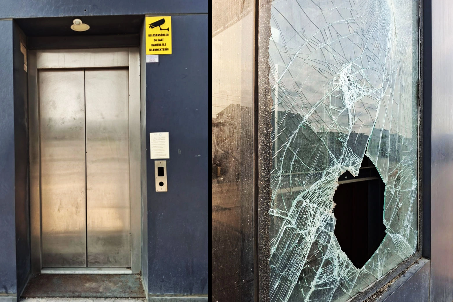Kimliği belirsiz kişi veya kişiler, camını kırarak girdiği asansör kabinini soydu.