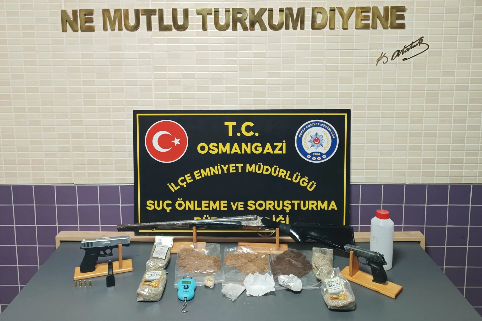 Osmangazi İlçe Emniyet Müdürlüğü Osmangazi Suç Önleme ve Soruşturma Büro Amirliği ekipleri, bir süredir peşinde olduğu uyuşturucu tacirlerine yönelik operasyon düzenledi. Yapılan operasyonda 6 şüpheli gözaltına alınırken, şahısları evlerinde yapılan aramada 1 adet hassas terazi, 1 adet çifte tüfek, 2 adet tabanca, 16 bin lira nakit para, 8 adet cep telefonu ve 512 gram uyuşturucu madde ele geçirdi. Şüphelilerin emniyetteki işlemlerinin sürdüğü öğrenildi.