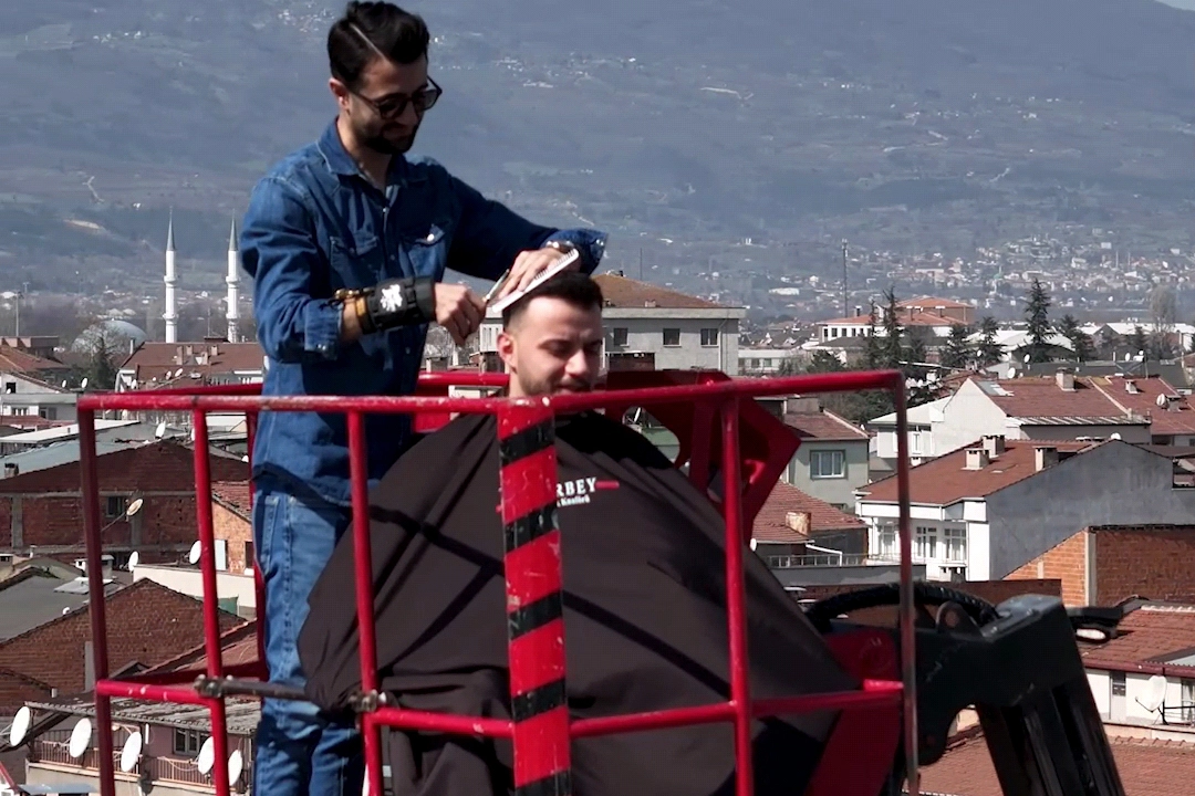 İnegöl ilçesinde 20 yıldır kuaförlük yapan Ziya Acar, mesleği ile ilgili farkındalık yaratmak için ilginç bir yola başvurdu. Arkadaşının satın aldığı vinci, Mahmudiye Mahallesi Kasımefendi Caddesi’ndeki dükkanının önüne getirten Acar, müşterisi ile vincin sepetine bindi. 26 metre yüksekliğe çıkan Acar, Uludağ manzarasına karşı tıraş yaptı. O anlar dron ile kaydedilirken, Acar'ın sosyal medyada paylaştığı görüntüleri 2 milyon kişi izledi.