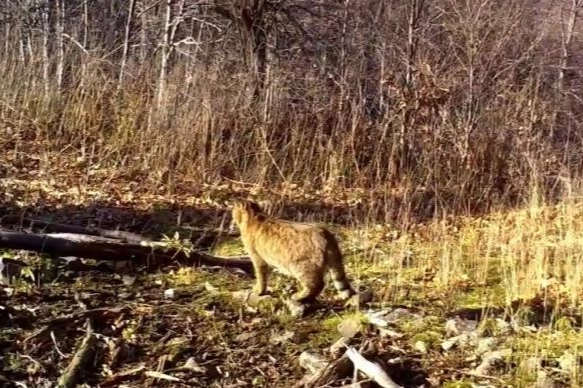 Ormanın derinliklerinde kaydedilen görüntülerde, yaban kedisinin kış gününde güneşli havayı fırsat bilerek doğal yaşam alanında dolaştığı görüldü.