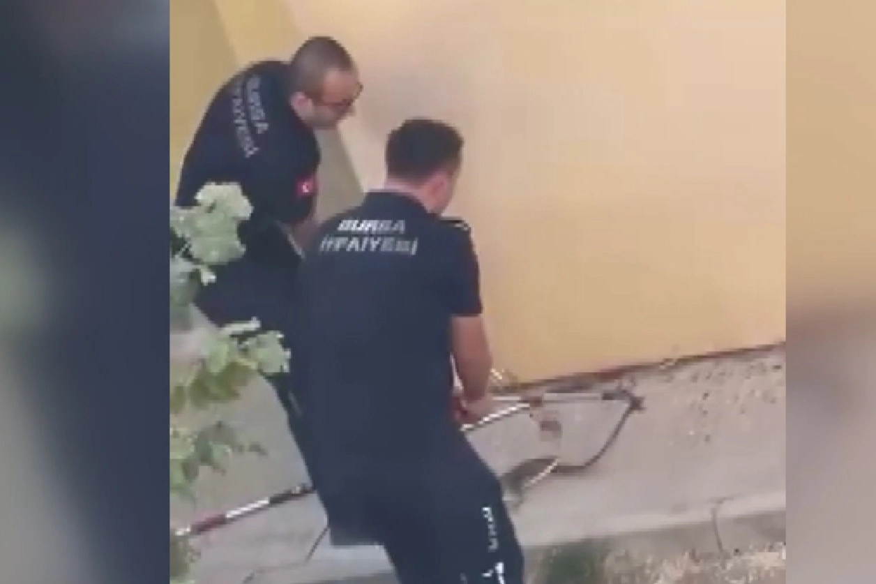 İnegöl ilçesindeki bir binanın bahçesinde yaklaşık 1,5 metre uzunluğundaki yılanı görenler, durumu itfaiye ekiplerine bildirdi.